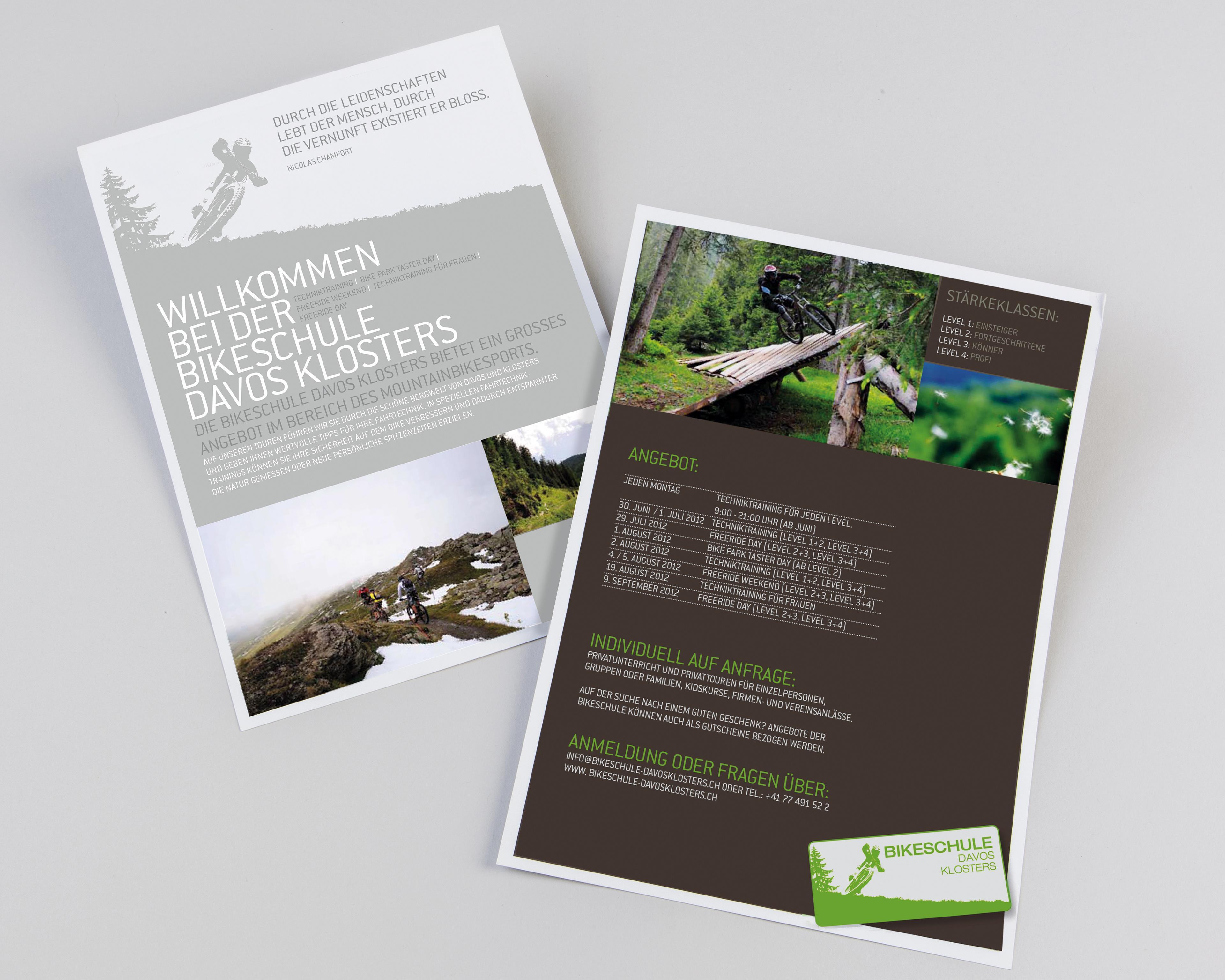 Für die Bike Schule Davos Kolster wurde ein neues Logo gestaltet. Aufbauend auf diesem Logo entstand ein ansprechender Flyer, der die wichtigsten Angebote und Kurse übersichtlich präsentiert. Ziel war es, ein einheitliches, professionelles Erscheinungsbild zu schaffen, das sowohl die Zielgruppe anspricht als auch die Werte und den Spirit der Bike Schule transportiert.