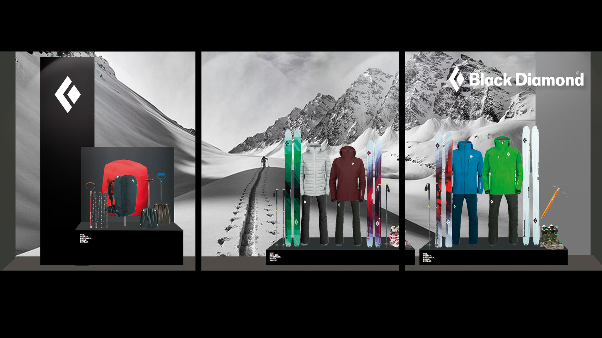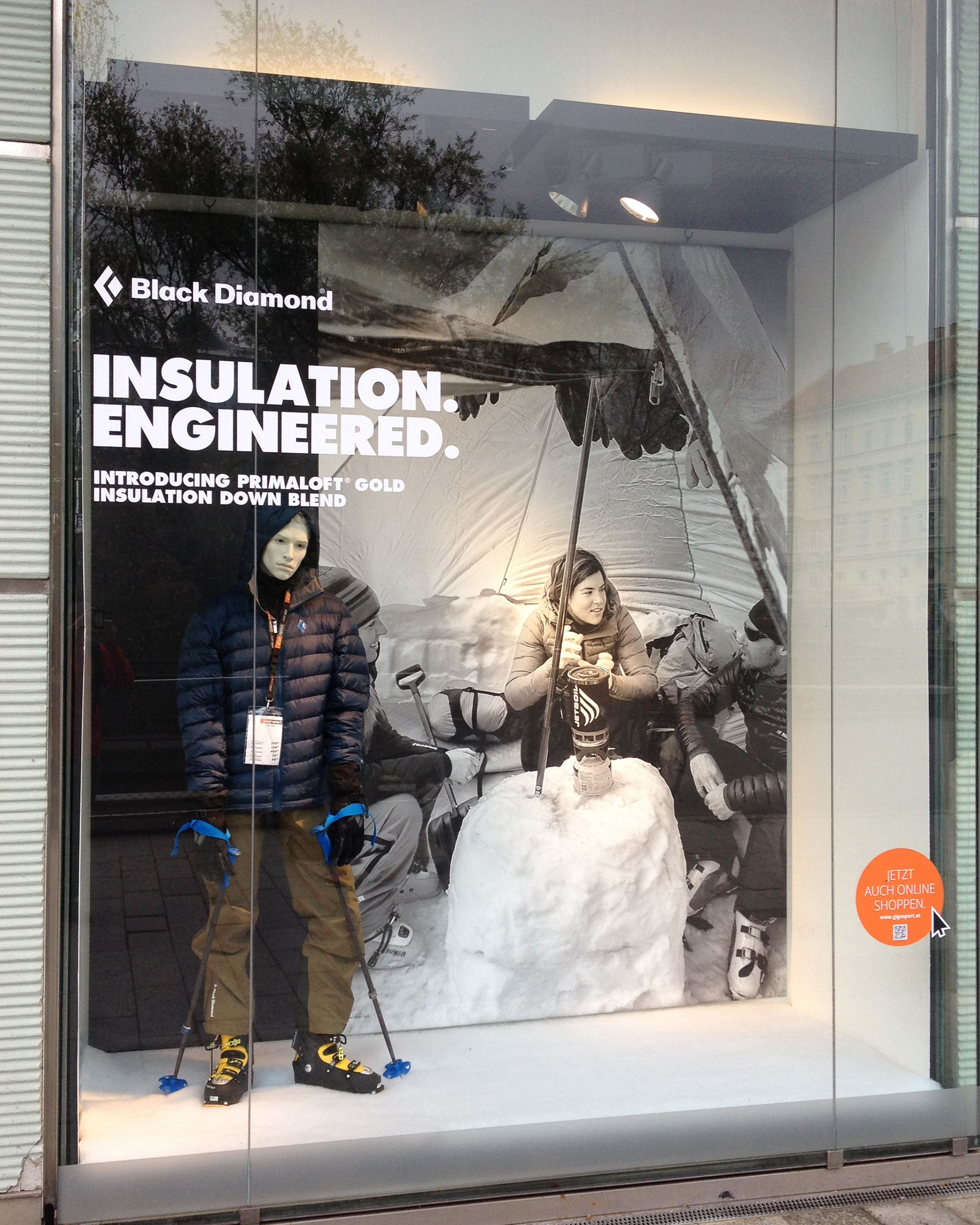 Black Diamond Equipment ist ein Hersteller von Ausrüstung für den Kletter-, Ski- und Bergsport mit Sitz in Utah, USA. Neben der Umsetzung verschiedener Schaufenstergestaltungen wurde das Sporthaus Schuster in München mit einem speziell entwickelten Schaufenster-Konzept unterstützt. Für die Wintersaison 14/15 standen die Kollektionsthemen Skitouren und Isolationsjacken im Fokus, wobei besonders die PrimaLoft-Technologie hervorgehoben wurde.