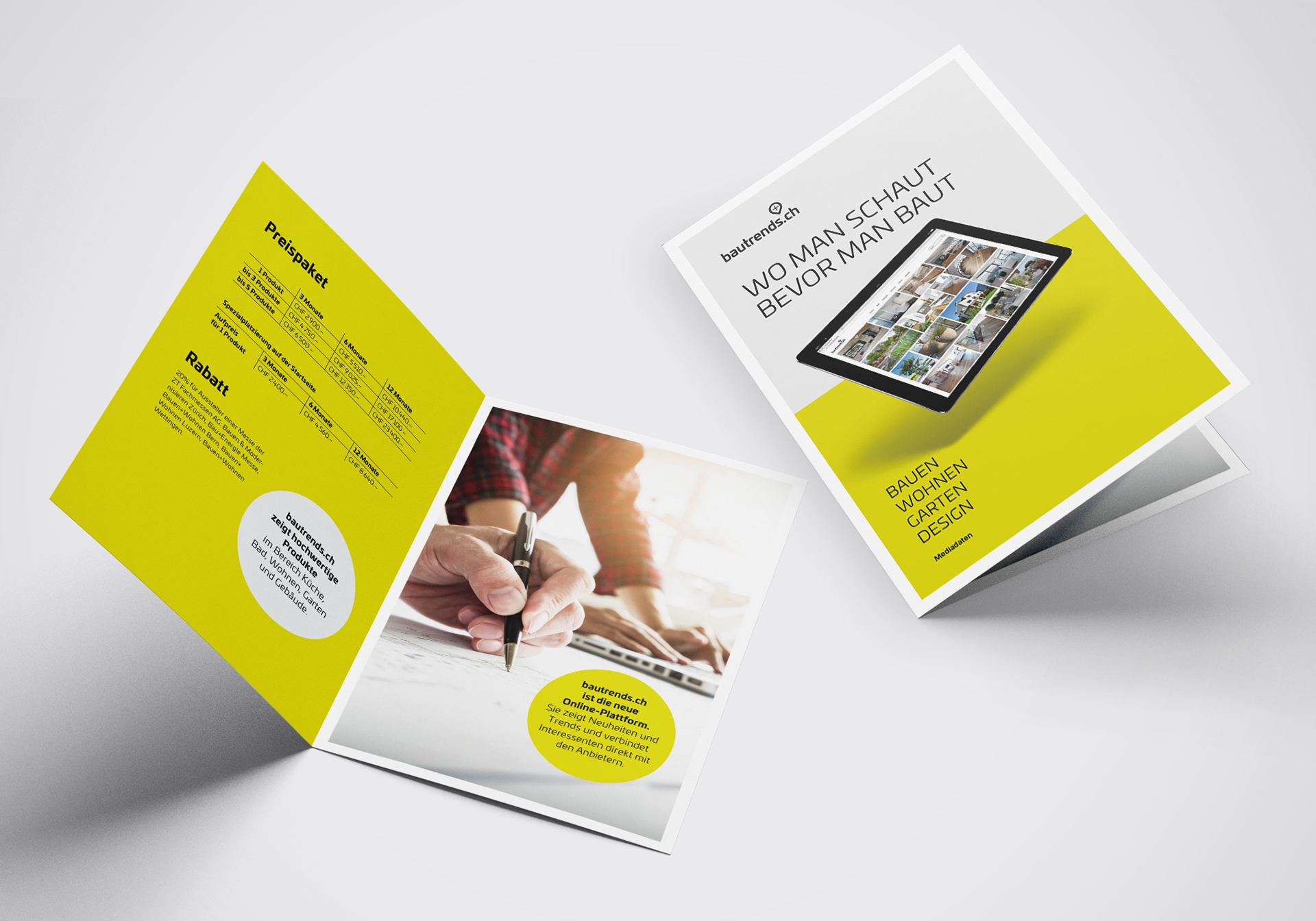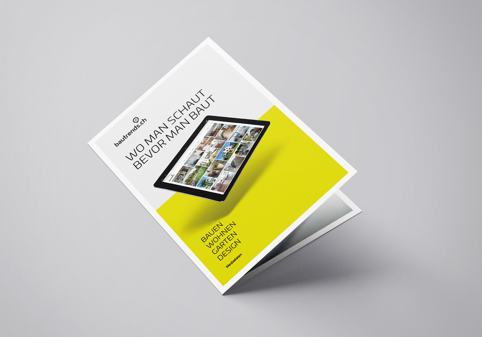 bautrends.ch ist eine Online-Plattform für Bau-, Einrichtungs- und Renovierungsprojekte. Um Unternehmen die Möglichkeit zu geben, ihre Produkte auf der Plattform zu präsentieren, wurde ein ansprechender Flyer entwickelt, der die verschiedenen Angebotsmöglichkeiten übersichtlich darstellt. Ergänzend dazu entstand ein eigenständiges Logo, das die Marke bautrends.ch stärkt und einen einheitlichen, wiedererkennbaren Auftritt in allen Kommunikationsmitteln gewährleistet.
