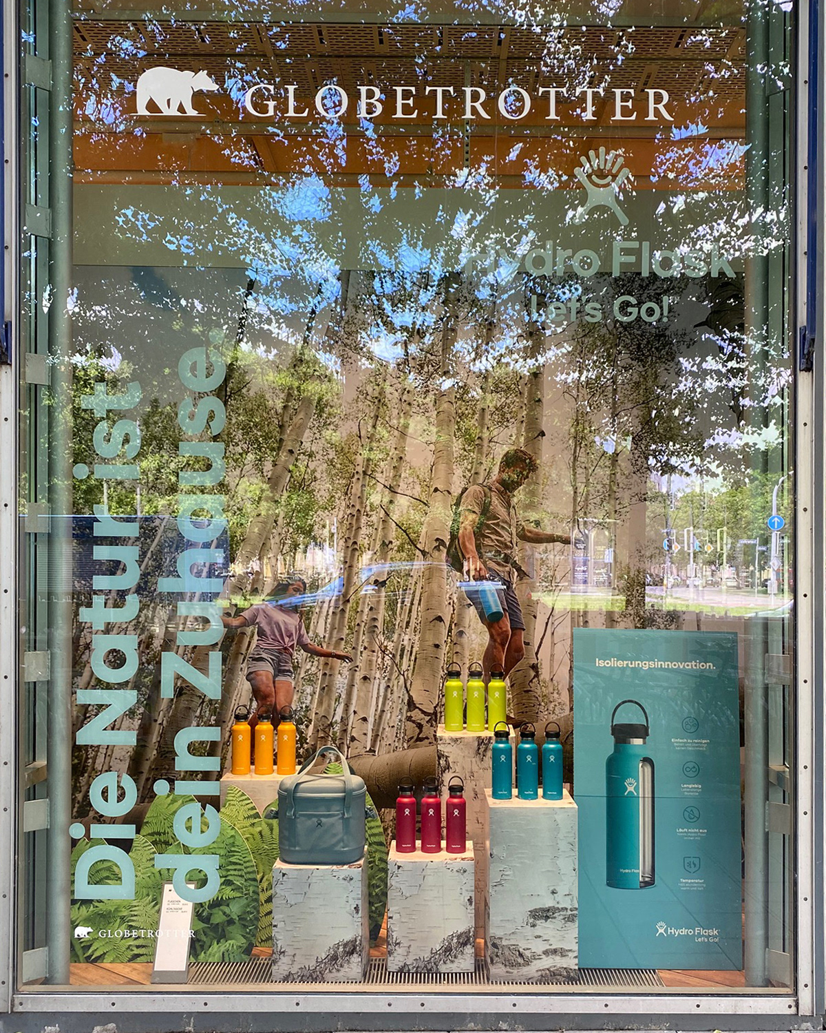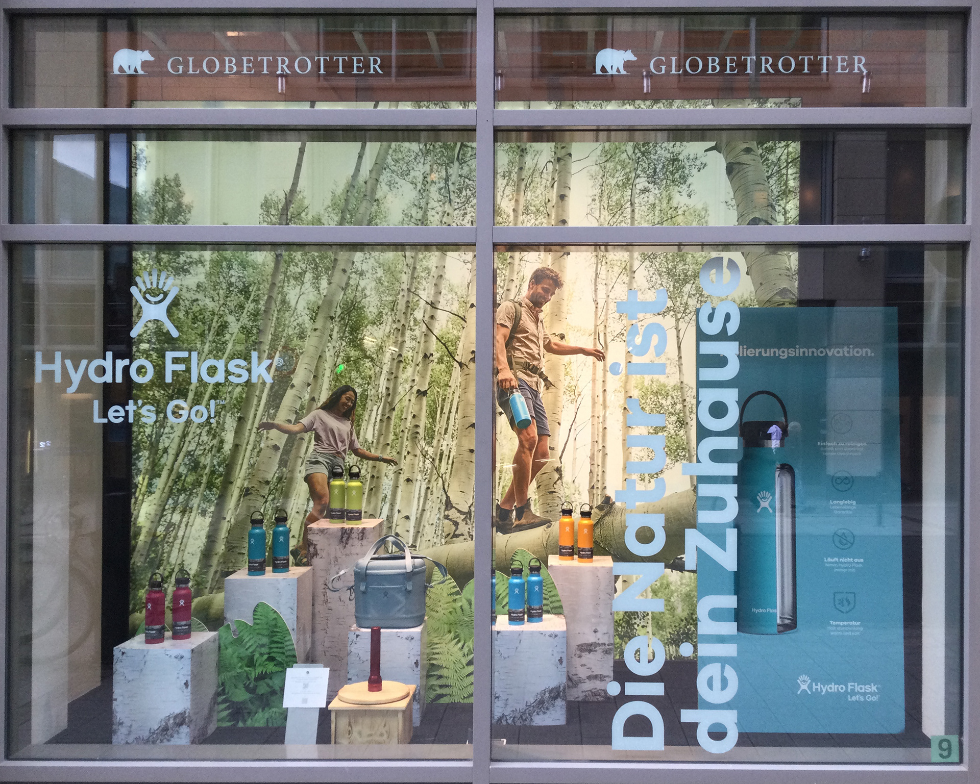 Hydro Flask ist eine Marke für hochwertige, vakuumisolierte Edelstahl-Trinkflaschen, Becher und Lebensmittelbehälter. Für Globetrotter Deutschland, einen der führenden Outdoor-Händler Europas mit rund 21 Filialen, wurden Schaufenstergestaltungen entwickelt, die sowohl technische Informationen als auch die neue Frühlingskollektion präsentieren. Die Displays sind dabei auf unterschiedliche Schaufenstergrößen abgestimmt.