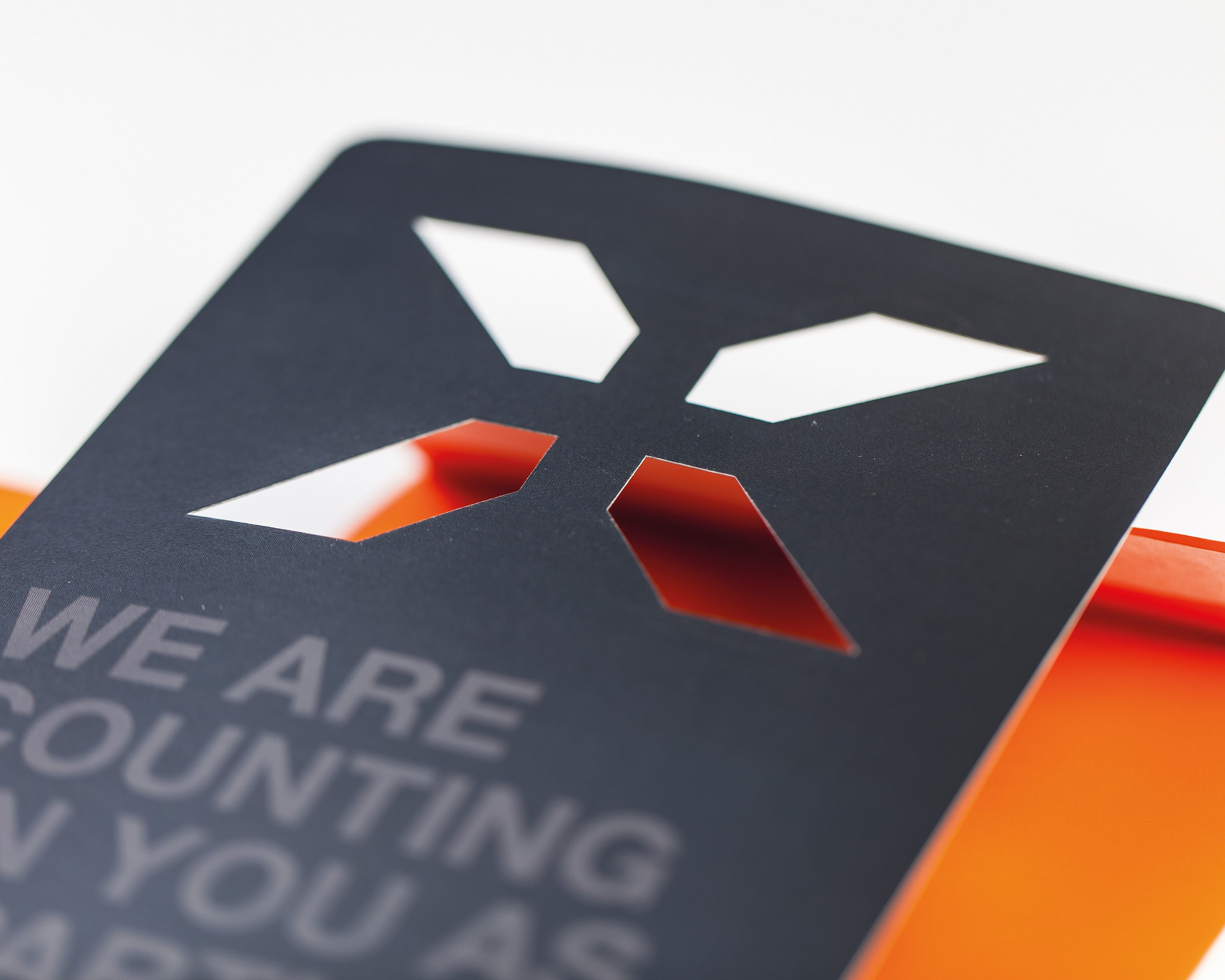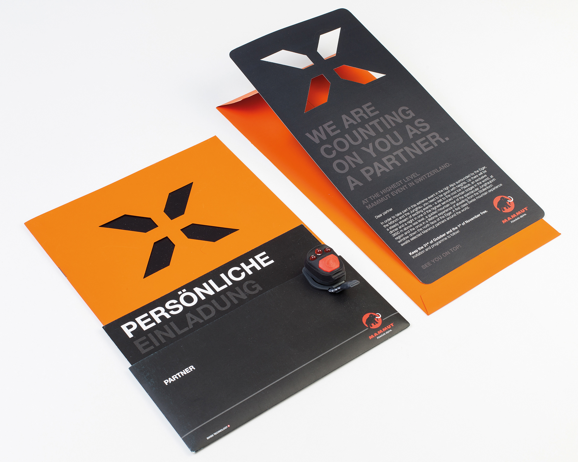 Die Mammut Sports Group AG ist ein Schweizer Traditionsunternehmen, das 1862 als Seilerei gegründet wurde und sich zu einem weltweit führenden Hersteller von Bergsport-, Kletter-, Outdoor- und Schneesportausrüstung entwickelt hat. Die Mammut-Linie «Eiger Extreme» ist für extremste Einsätze entwickelt. Ihr Erkennungszeichen ist das stilisierte «X», das sich durch alle gestalteten Printmedien zieht. Für den Launch der Linie entstanden dafür eine personalisierte Einladung und eine Broschüre – gedruckt und gestanzt.
