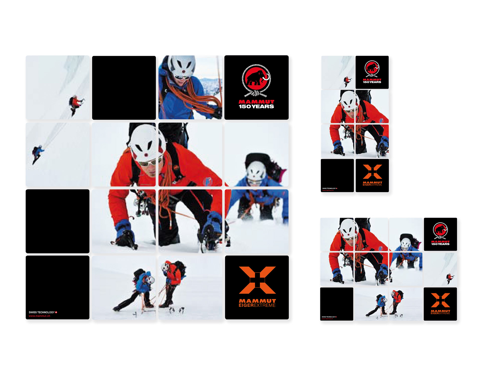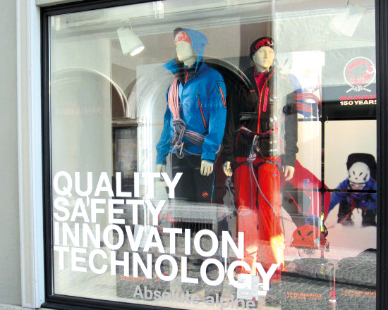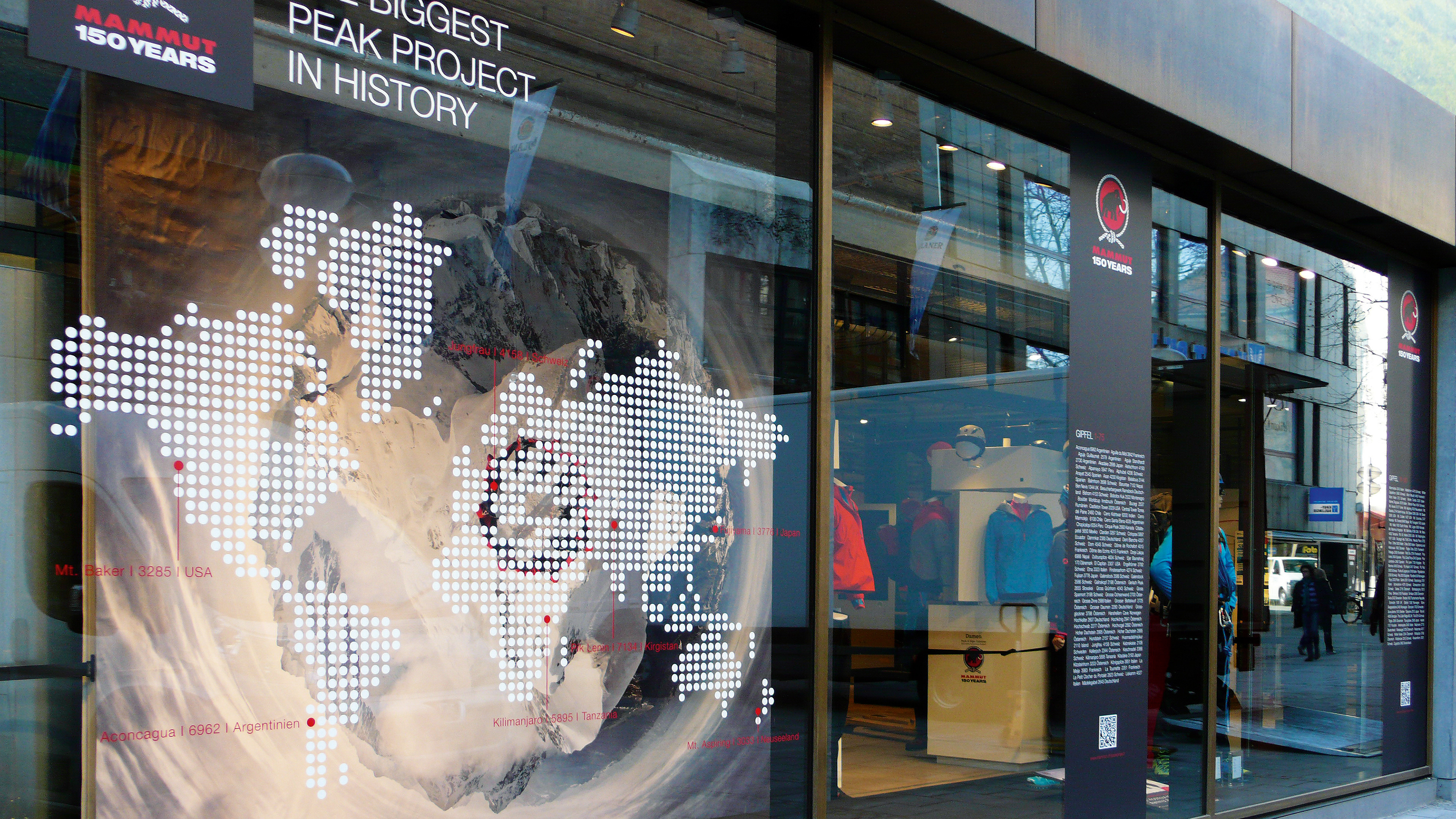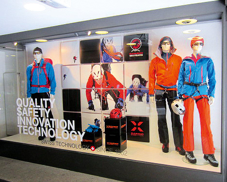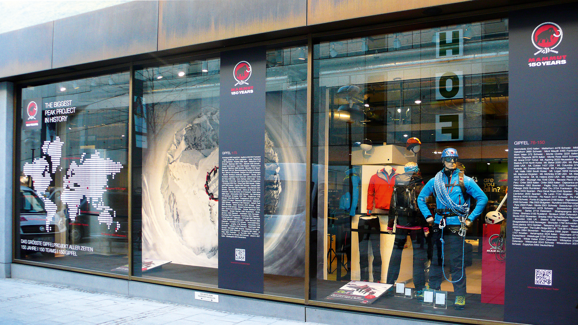 Die Mammut Sports Group AG, 1862 als Seilerei gegründet, ist heute ein weltweit führender Hersteller von Bergsport- und Outdoor-Ausrüstung. Zum 150-jährigen Jubiläum startete Mammut das «Peak Project»: 150 Seilschaften bestiegen in 15 Monaten 150 Gipfel weltweit. Anlässlich dieses Meilensteins wurde für das Sporthaus Schuster in München eine individuelle Schaufenstergestaltung entwickelt. Für die Premiumkollektion «Eiger Extreme» sorgt ein modulares Kachel-System für flexible Anpassung an unterschiedliche Schaufensterformate.