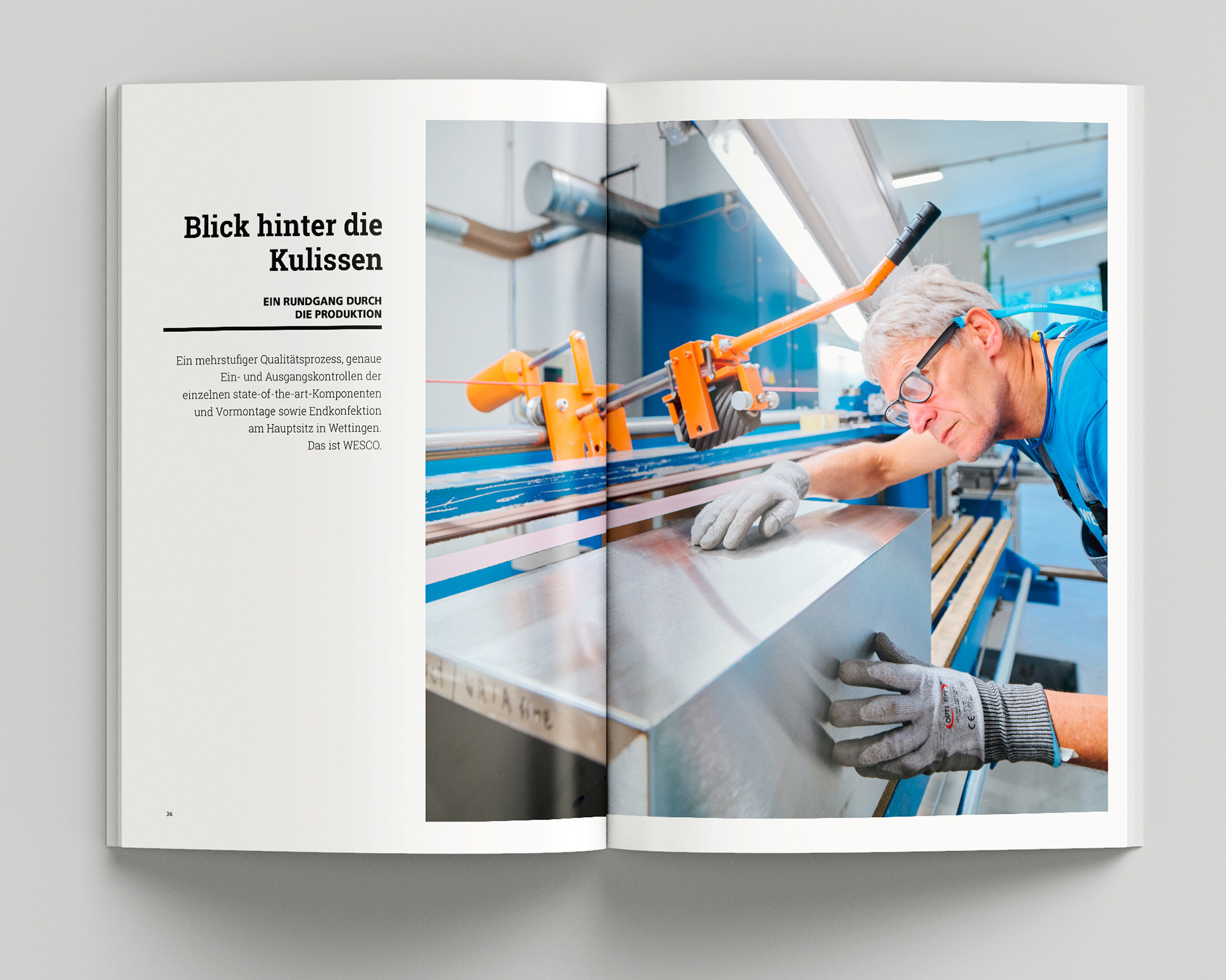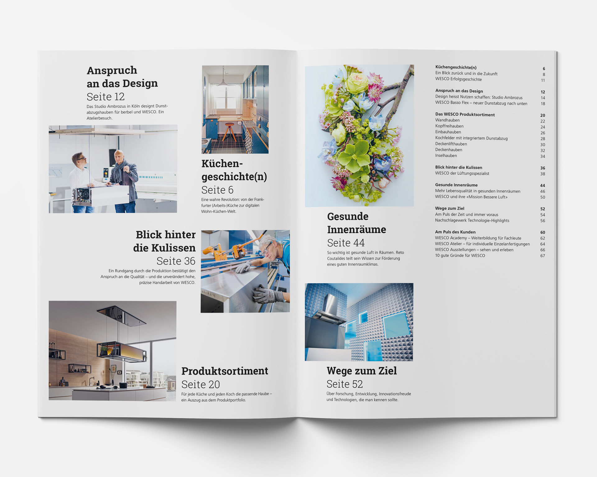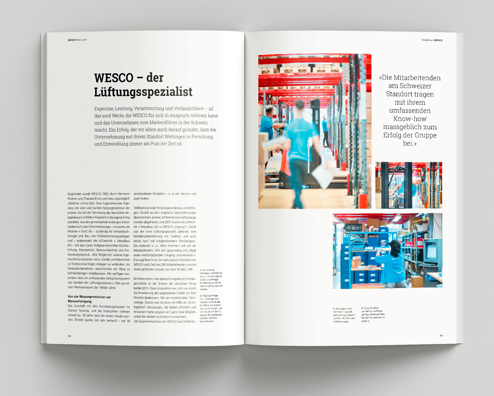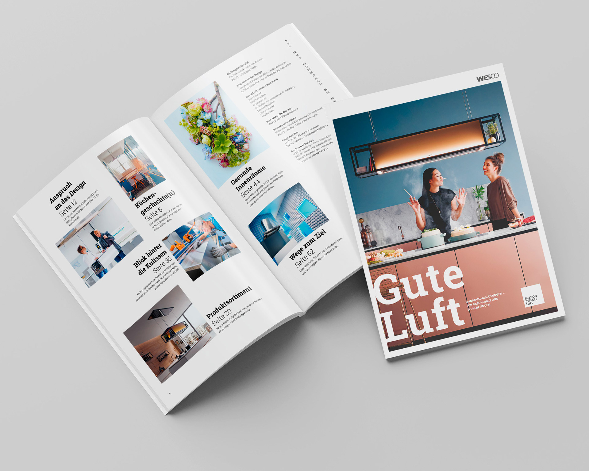 WESCO ist ein Schweizer Spezialist für Lüftung & Luftfiltration, mit dem Hauptsitz in Wettingen. Die Broschüre „Gute Luft“ vermittelt spannende und informative Inhalte rund um Küche, Luft, Design und Produkte. Ziel war es die Expertise von WESCO anschaulich zu präsentieren und den Leser auf ansprechende Weise zusätzlich über die Produkte und Lösungen des Unternehmens zu informieren.